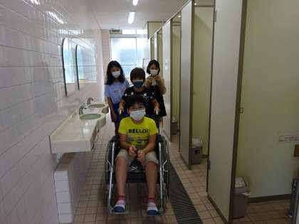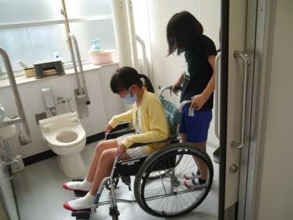 学校内にも,車いす用のトイレがあります。今回は,車いすにのってトイレに入って,帰ってくる体験もしました。普通のトイレよりも広い室内に,大きな手すりがついていること等,車いすの方が安心して使うための工夫を見つけることができました。