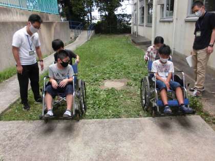 学校の中にある段差をのりこえる体験をしました。段差は低いのに,思うように車いすが持ち上げられないことに驚いている様子でした。