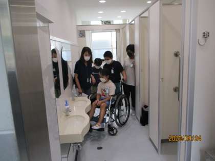 二種類のトイレの中に車いすで乗り入れて,その二つのトイレのちがいを考えました。