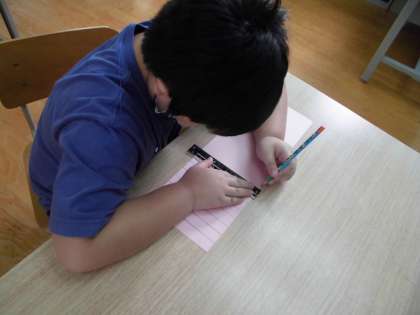 はじめにピンクの画用紙に線を引いたり,引いてある線に沿って