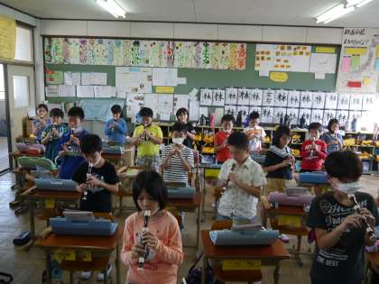 音楽の学習では,茶色の小瓶をリコーダーや鍵盤ハーモニカを使って演奏しています。