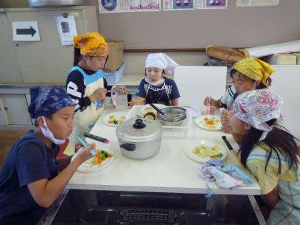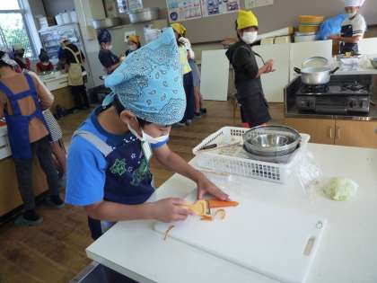 今日は,野菜をゆでる活動をしました。ゆでる前に洗って切ったり,水からゆでる物と湯からゆでる物をしっかり考えて調理したりしました。事前に何度も役割や動きを確認したおかげで,どの班も自分たちで順序良く活動することができました。包丁の使い方,コンロの使い方にも気を付けて,安全に学習を進めることができました。