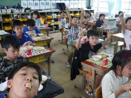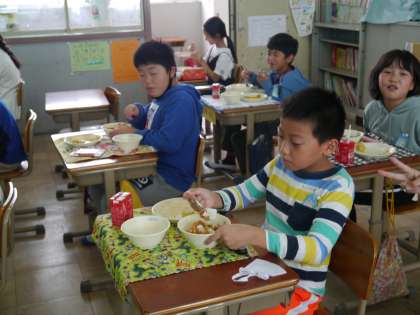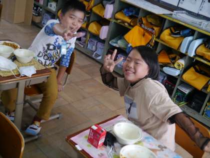給食の時間をいつも楽しみにしている子ども達。コロナウイルス予防のために自由に話すことができないのは残念ですが,いつも楽しく食べています。