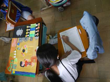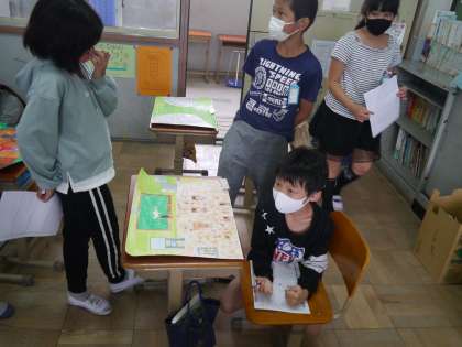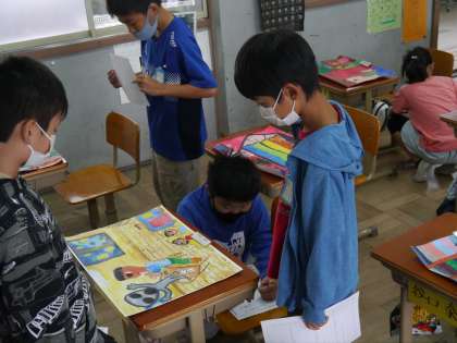 図画工作科の授業では,友だちと作品を見せ合って,面白いと思ったところや真似してみたいと思ったところを交流しました。