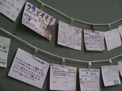国語の授業で自分で選んだ本を紹介するポップを作りました。絵を描いたり,テーマに合わせて画用紙の形を切ったりして工夫をしていました。