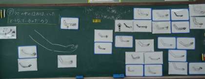 今日は,自分の体にある骨の形を,腕を見たり触ったりしながら絵にかいてみました。次の授業では,骨格標本を見ながら,詳しく観察していきたいと思います。