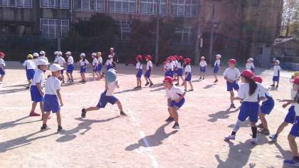 体育科「なげあそび」の学習で,2年2組と3組でドッジボールを行いました。