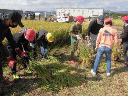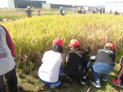 農家の方の話を聞いた後に,3.4組で稲刈りをしました。