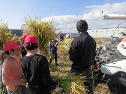 刈った稲を機械に入れて脱穀する様子を見せていただきました。