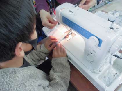 難しいところも班で協力して,手作りマスクを作りました。