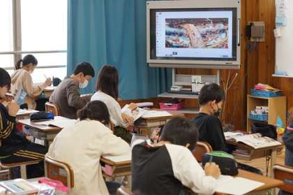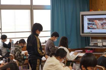 歴史の学習では,資料からわかることを話し合っていました。今日は資料の絵から「人がたくさんいる。」「大きな舟や小さな舟がある」・・・といろいろな気づきがたくさん出ていました。自分の意見を伝えようとする意欲的な姿が素敵です。
