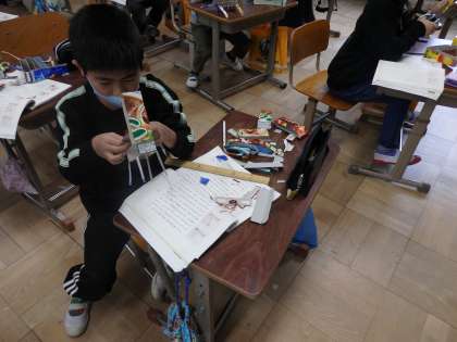 今日は国語科で学習している「馬のおもちゃの作り方」で,馬のおもちゃを実際に作る学習をしました。作り方の順序を確認しながら,写真や友達のアドバイスを参考に馬のおもちゃが出来上がりました!「動く動く!」と言いながら,今にも走り出しそうなかわいい馬のおもちゃです。