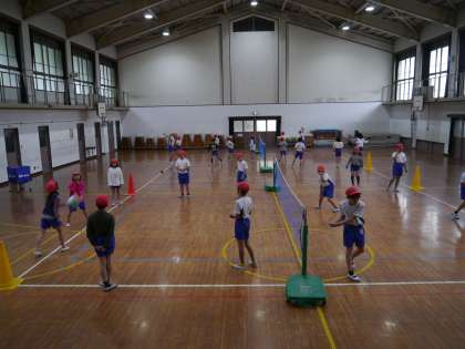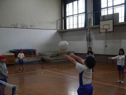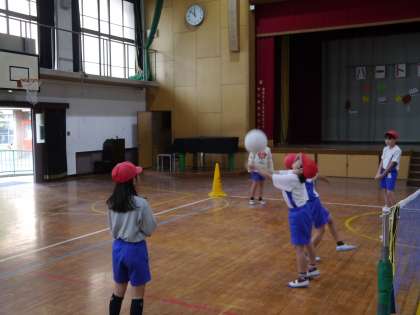 ソフトバレーボールで,ラリーを繋げる練習中です。飛んできたボールを一生懸命体を動かして追いかけていました。
