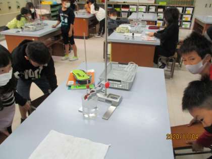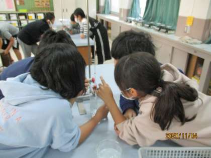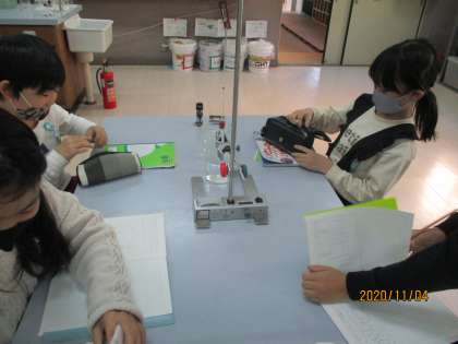 空気の実験に引き続き,水の体積の変化についても調べました。空気と同じように体積が変化するのではないかと思い,ドキドキしながら実験にのぞんでいました。