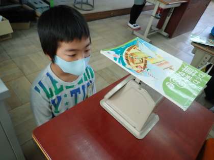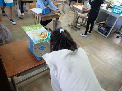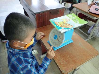 算数の学習では,はかりを使って重さをはかりました。はかりの目もりのよみ方や,のせ方を知り,まずは算数の教科書をはかってみました。