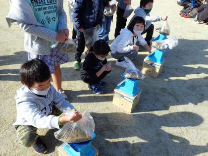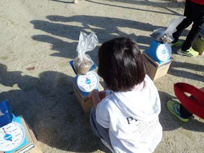はかりで1kgをはかりました。袋の中に砂を入れて,自分で1kgを作ります。子どもたちは,「多分これくらいやろ!」「だいだい1kgくらいになったんちゃうかな?」と言いながらはかりにのせていました。