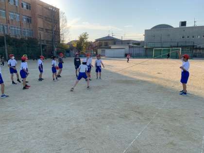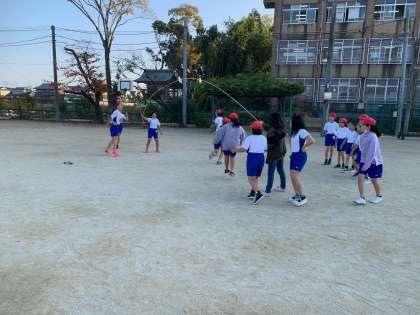 前とび,後ろとびで,誰が一番とべるのか。100回するのに何分で終われるか挑戦しました。最後は大縄で男女に分かれて勝負をしました。