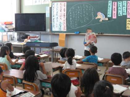 国語科では,「おむすびころりん」の学習をしています。これまで,宿題で練習してきたことを生かして,リズムよく元気に読んでいます。おにぎりの動きを体を動かしたり,テレビを見たりして学習しました。最後には,グループで劇をしてよかったところを発表します。日本の昔話を楽しんでほしいと思います。
