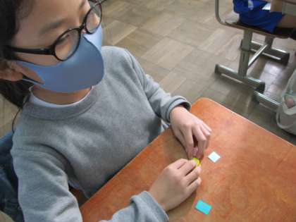もらったいろいろな形のカードを使って,ロケットやピエロの顔を表現して当てるゲームもしました。