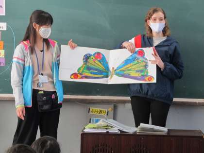 子どもたちは,カードを渡す側ともらう側に分かれて,英語を使ってやり取りしています。