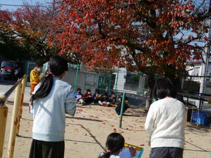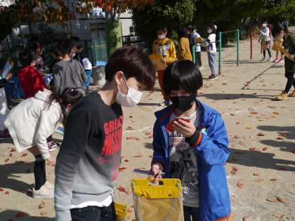もうすぐ冬になりそうですが,学校の桜や紅葉はきれいな赤に色づいています。「どうして赤く色が変わるのかな?」,「すごくきれい!」と楽しそうに観察をしていました。学校の中に落ちている葉を拾い集めて,持ってきてくれる児童もいます。冬になるとどんな生き物が見つかるかな?楽しみですね!