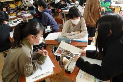 外国語活動では京都市内の紹介をしようと,今日はテーマを決めていました。班で活動することも多く,友達同士で話し合って楽しく学習しています。