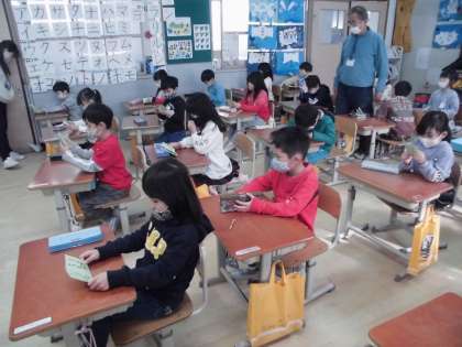 1月27日,28日は,栄養教諭の竹原先生に来ていただいて,栄養の学習をしてもらいました。今回は,「まほうのたべかたで,たべものとなかよし」という学習で,苦手なものが食べれる「まほうのたべかた」を教えてもらいました。一人一人が,「まほうのたべかた」のおまじないを書く冊子をもらい,喜んで読んでいました。これからも,いろいろな食べ物をしっかりと食べようとする意欲をもって,食生活を楽しんでほしいと思います。