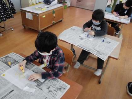 はじめにマジックで絵を描きました。2月2日が節分ということもあり,