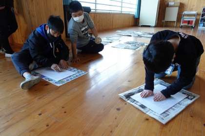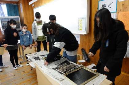 版画が完成しました。今年は修学旅行の思い出を描きました。初めての面彫りで,「どこを彫ったらいいんだろう」と戸惑っていましたが,だんだんと慣れてきて,彫るのも楽しくなっていました。インクを付けて刷る時も,「どきどきする。」「うまくいくかな」と言いながらも,満足いく作品に仕上がりました。