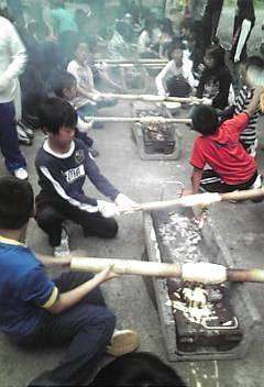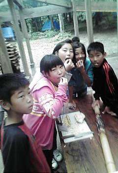 朝は曇り空ですが,予定通りの活動をしています。まずは,バームクーヘン作りに挑戦。生地を練って,竹に巻付け,焼いてはまた生地を塗って焼くを繰り返します。