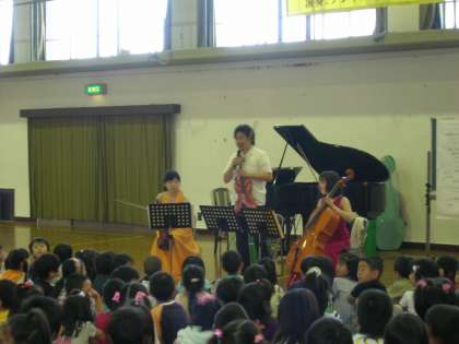 5月29日(金)に,低学年と高学年に分かれて『子どものための音楽入門教室「のだめカンタービレの世界」』というタイトルで実施しました。低学年は,『崖の上のポニョ』『エーデルワイス』などを,高学年は,『となりのトトロ』『風の丘』など,子どもたちのよく知っている曲をヴァイオリン・ヴォラ・チェロ・ピアノで美しく演奏してくださいました。