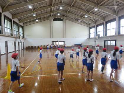 体育の5年生のはじめの学習として「体ほぐしの運動」を行いました。いろいろな動きを取り入れた運動をして,体をほぐしてみました。「どう動くんやろ?」「足が上手く動かないな。」と考えながらチャレンジしていました。