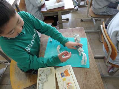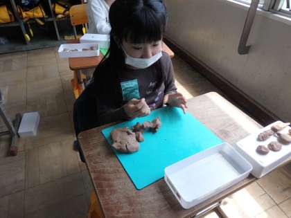 ねん土をぎゅっとにぎって,形を変えたり,できた形を見て何ができるかを考えたりしていろいろなものを作りました。おいしそうなお寿司や本物みたいな虫など思い思いの作品を楽しそうに作っていました。