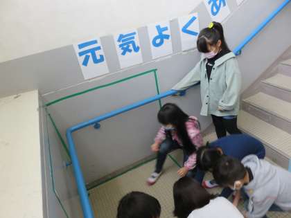 算数科では,「1㎥」の学習をしました。階段の踊り場に「1㎥」の大きさをテープで貼って作りました。「1㎤」のキューブを使って,これが何個分あるのかということを考えました。「1,2,3,4・・・」と数えていくと,「多すぎてわからん。」と困っている子もいました。