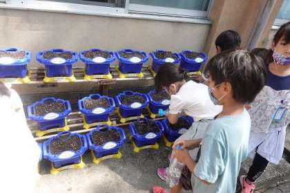 「ふわふわの土がいいと思う。」「たくさんの水がいるよ。」「おひさまからも元気をもらっていると思う。」「あんまり深すぎたら,種が出てこられないから,あかん。」とこれまでの経験を生かして,どんな風に育てていくかも考えることができました。