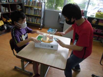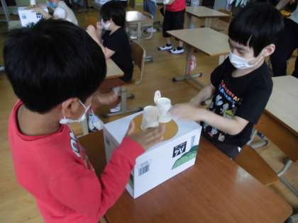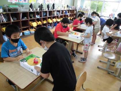 紙コップを切って,トントンずもうを作りました。作った後はみんなで対決して遊びました。その次の時間には折り紙でもトントンずもうを作って遊びました。みんな自分の作ったお相撲さんで楽しんで対決することができました。