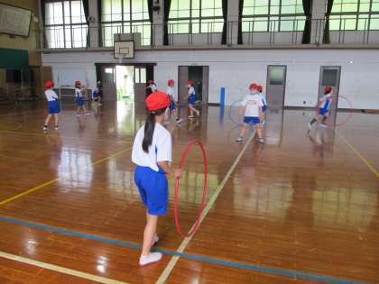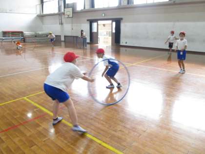 体ほぐしでは,フラフープを転がして,二人でキャッチし合ったり,転がしているフラフープの輪をくぐったりしました。