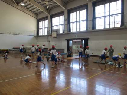 運動場ではソフトボール投げ,体育館では立ち幅跳びと反復横跳びをしました。