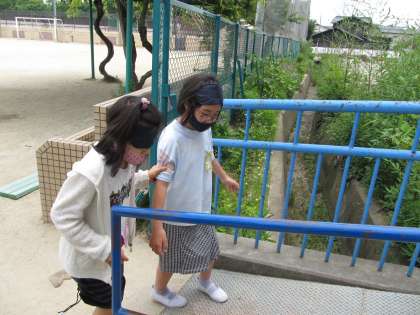 ペアの子に誘導してもらいながら,小さな段差や坂道を歩きました。
