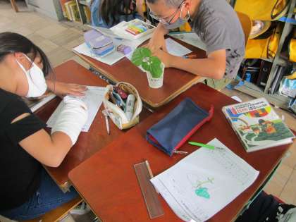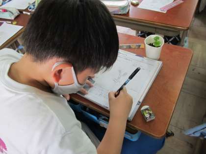 種を植えたツルレイシの芽が出はじめました。成長を記録するために,観察カードをかきました。