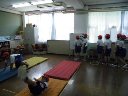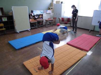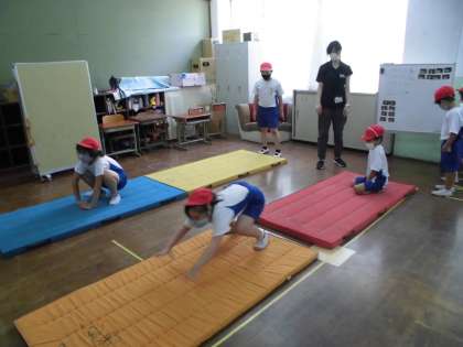 体育でマット運動をしました。かえる跳び,川渡り,ブリッジ,前転,手押し車などみんな楽しんで活動していました。