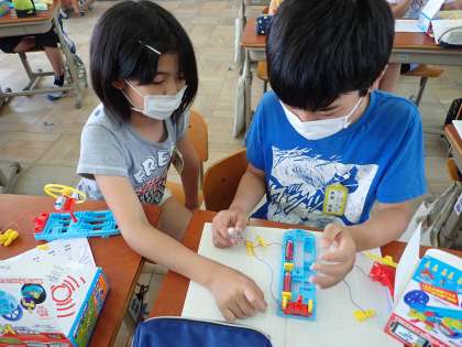 理科の電池のはたらきでは,もっとプロペラを速く回すためには,どうすればよいのかを考えました。