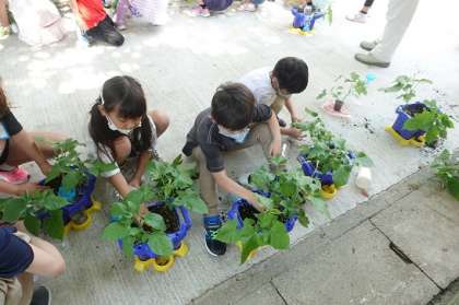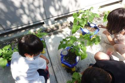 しばらく見ていない間に,アサガオがとっても大きくなりました。「森みたい!」「はっぱがたくさんあるわ!」と成長にびっくり。そんな姿をみて「アサガオ,せまいって言ってる。」「広くしてあげたい」「このままやと折れちゃう」と子どもたちから優しい声があがりました。
