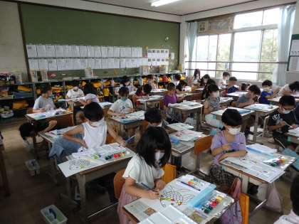 今週は,みんなが待ちに待った絵の具を使う学習をしました。絵の具のセットを机に並べて,バケツに水を入れて,パレットにきれいな絵の具を出して,「にじいろのさかな」を丁寧に塗っていきました。色とりどりの素敵なにじいろのさかなが教室にたくさん並びました。