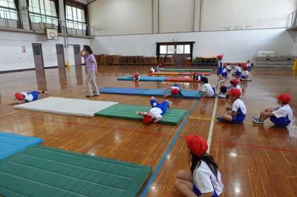 マットあそびが始まりました。先生のまねっこできるかな??「くるんと前回りをしたい」「落ちないようにできるよ!」「ちゃんと立てた!」とまねっこも上手です。「がんばれ!」「手がパーでよかったよ!」とお友達のもよく見ています。