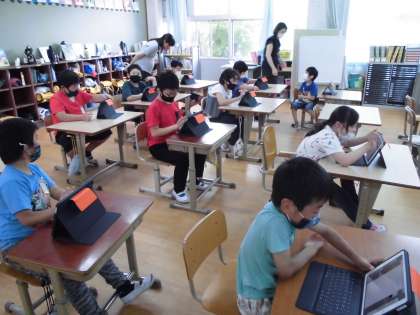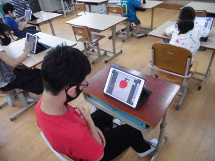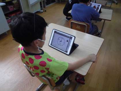 タブレットを使うと聞くと,子どもたちはとても喜びます。今回はタブレットをを使っていろいろな絵を描きました。みんな指を使って上手に描いていました。最後には描いた絵の発表会をしました。