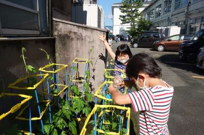 アサガオが気が付けば,どんどんツルを伸ばしています。「長くなってる!」「わたしより大きいよ!」とアサガオの成長にびっくり。「大きくなりすぎて,土が見えない〜!」と葉っぱの成長も実感しています。毎日の水やりが楽しいですね。みんな大事に大事にしています。