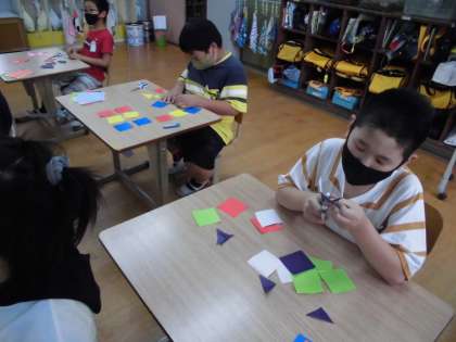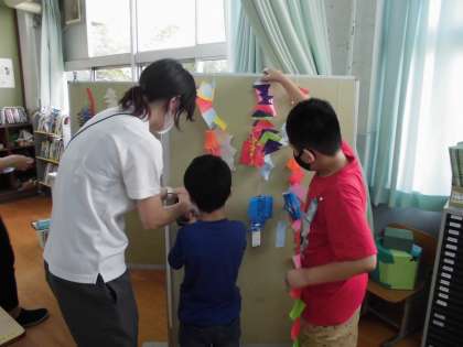 おりがみを使って,七夕のかざりを作りました。一番下には七夕のお願い事もかきました。みんな何をお願いしようかなと真剣に考えていました。