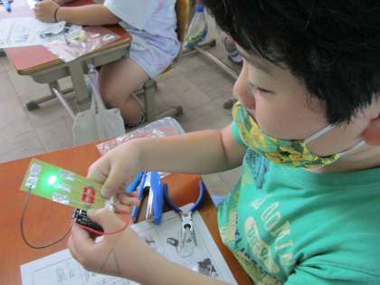 出来上がったLEDライトを光らせてみると,赤・青・緑に光り,2つを一度に光らせたり,3つを一度に光らせたりすると,色が混ざり,違う色に光ります。この3色は光の三原色と呼ばれており,その組み合わせで映像などを写していると知りました。
