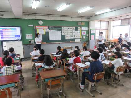 外国語の学習では,英語で友だちに好きな教科を尋ねたり答えたりする学習をしています。「I lile P.E」と友だちが答えると,「Why?」と理由を尋ねたりしていました。